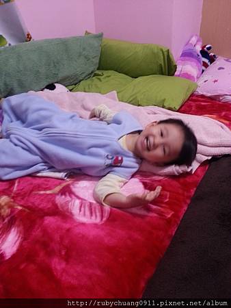 穿這個目前25℃~26℃的室溫,還真的是有點熱,齊齊裡面只穿一件包屁衣而已,然後也不需要蓋被子