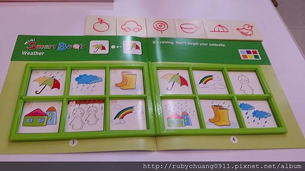 Smart Book 1. animal & plant 2. outdoor fun 3.alphabet 4.weather & time(時鐘的判別大約需要中班才會唷)